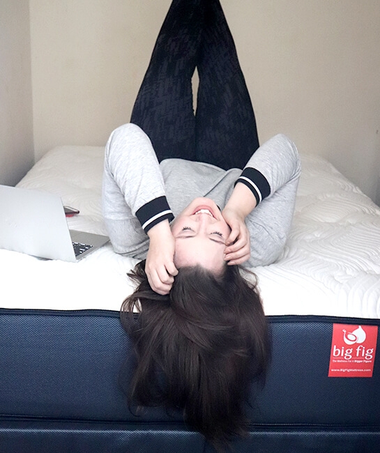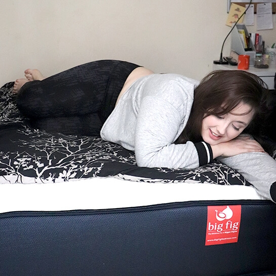 My first thoughts after diving into my Big Fig was “Wow, this is firm." I have never slept on a firm mattress before like this but having slept on it now for several months I can honestly say I have NEVER been this happy with my mattress before. A few years ago, I was in an unfortunate bus accident that left me with some serious lower back pain. I always woke up with an achy lower back but since sleeping on my Big Fig Mattress I haven’t had this back pain in the mornings. It’s been a true blessing waking up without any pain! As a pretty solid sleeper, I have found it to be a happy addition to my sleep cycle. My boyfriend, who is also a full-figured person, is a very wiggly sleeper and he is quite jealous of my Big Fig Mattress. We both sleep very soundly on it and even when he wiggles around, he doesn’t disturb me. He can’t wait to get a Big Fig of his own! I always look forward to coming home at the end of the day and not sinking into my bed but being embraced by the comfort of my Big Fig.